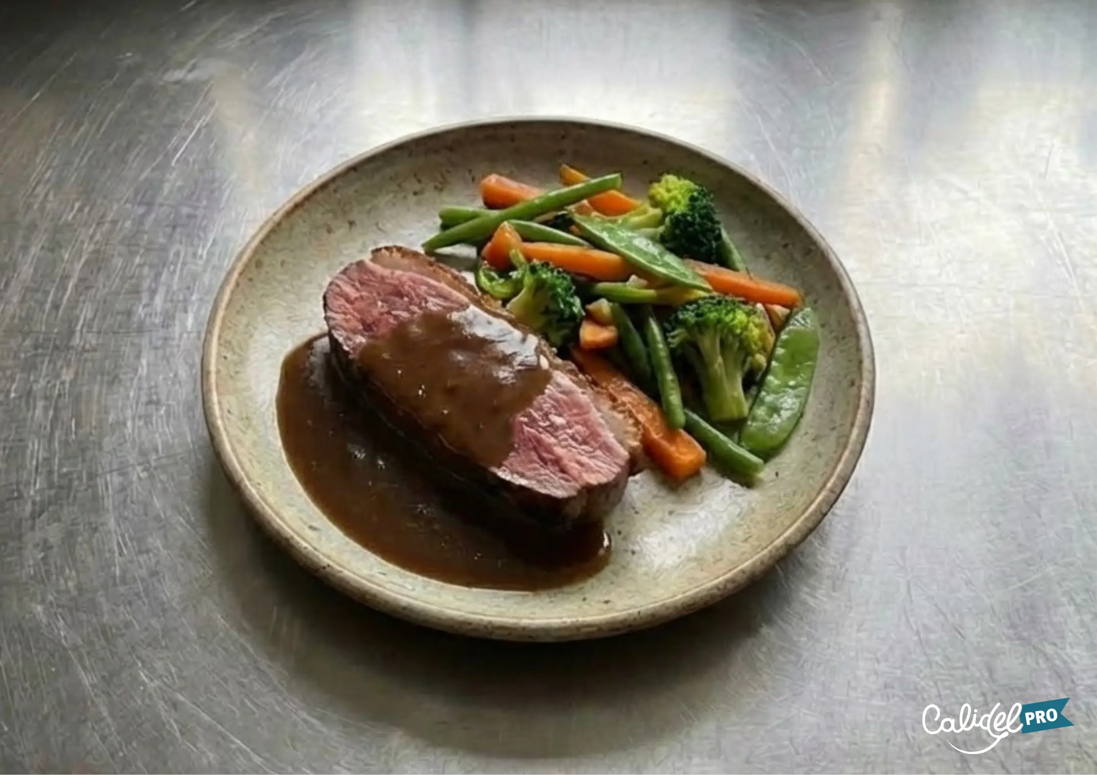 - Ajouter les légumes croquants à côté et un peu de fleur de sel sur la viande pour la finition.