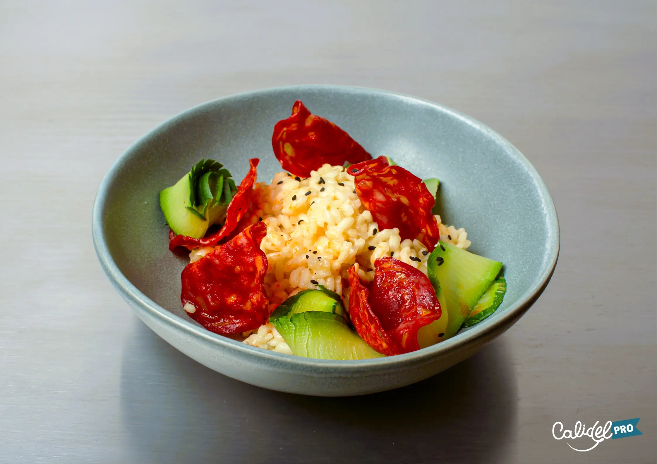 - Placer le risotto dans le centre de l’assiette, puis quelques chips de chorizo et les tagliatelles de courgette autour.
